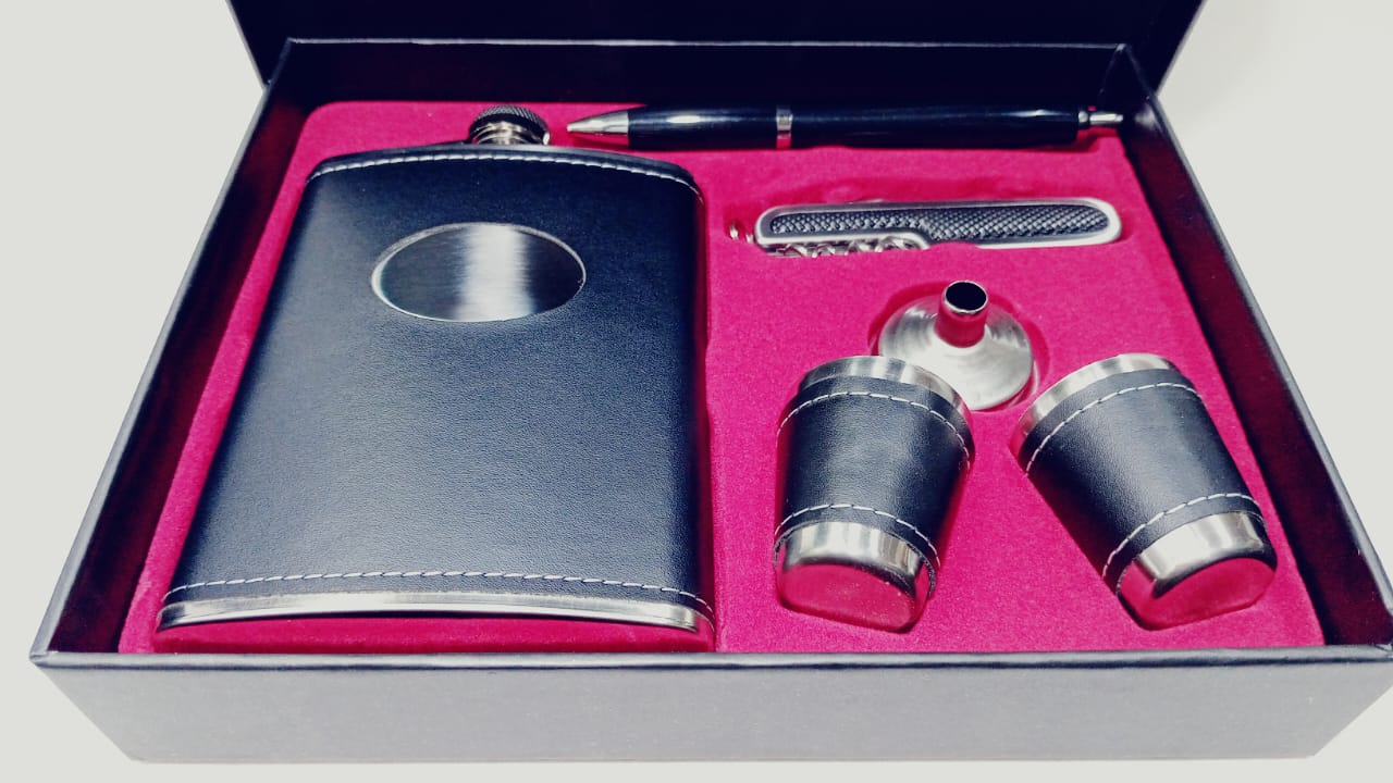 Set de Petaca con Vasos y Lapicera en Caja